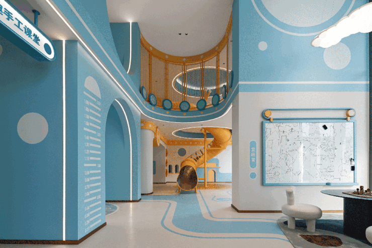 日咖夜酒空间旁,明丽跳跃的色彩搭配、玩法多样的游乐设施,一看就是孩子们“乐不思家”的童玩天地。