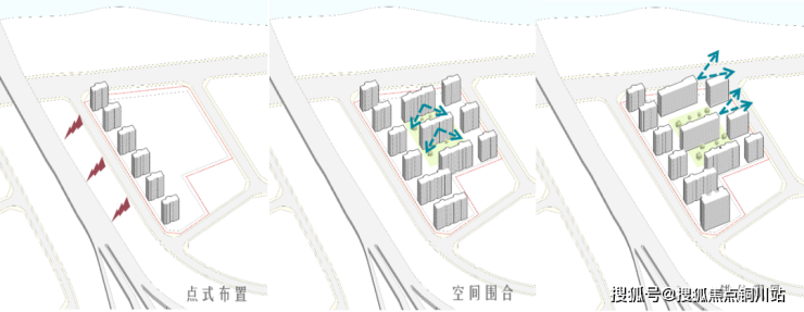 在规划布局上,项目采用板点结合、错位排布的空间结构;西侧点式布局减少沿街户数,最大程度上规避高速对小区的影响,中间板式布局延展横向空间,最大程度上围合大尺度中央景观庭院;规划整体错落有致,张弛有度的空间序列也提供了更好的观河观景视野。