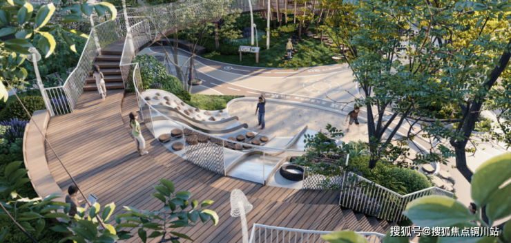 经过社区大堂就是约3600平方米超大尺度中心景观区,采用中式造园手法,强化高差体验,通过叠水、塑山、挑台、飞虹、跌瀑等实现景致的层次错落,塑造多维空间,在繁华中重拾朴素自然之美。