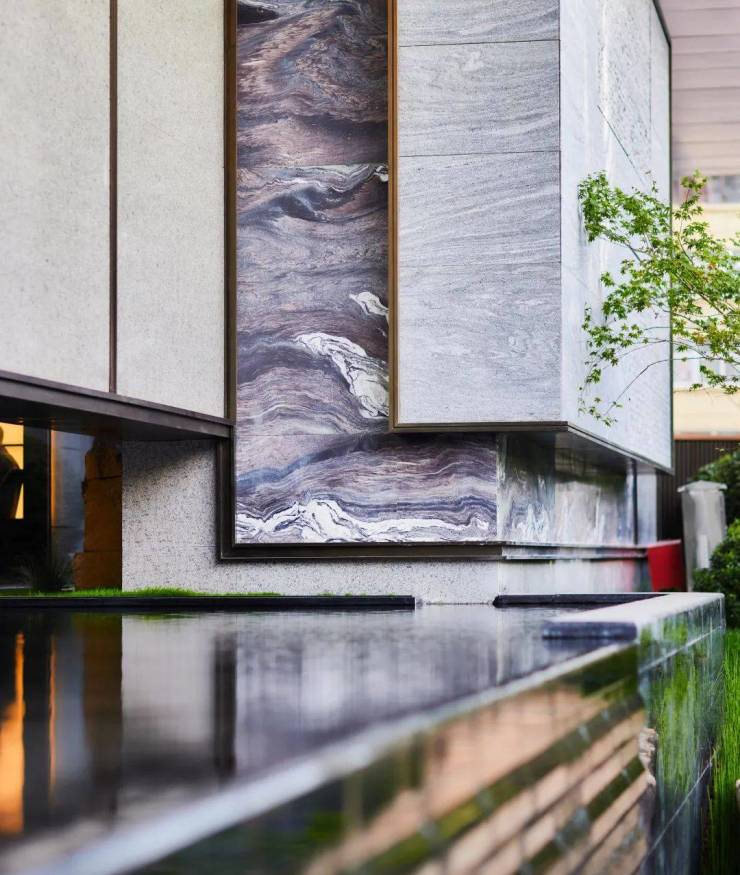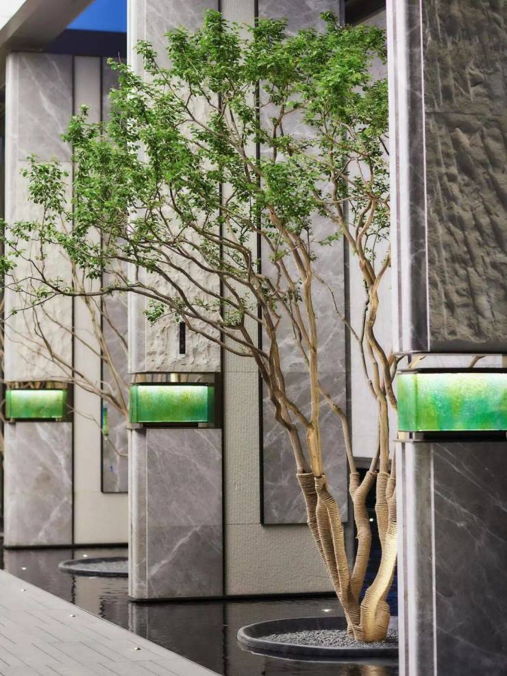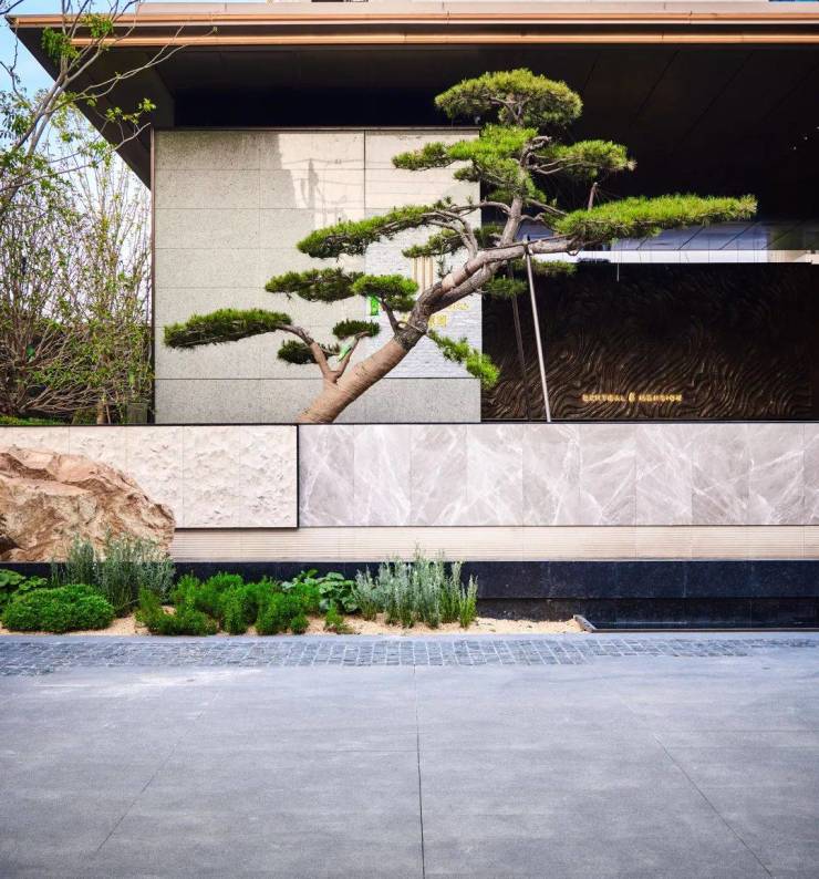 造型松柏与镜面水景构成解构主义画卷