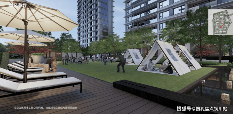 设计师考虑到社区邻里的闲暇共聚,甚至未来的社区集市,特意配置了400㎡的微风草坪邻里共享聚场,用草地、雕塑、平台、躺椅、树阵、景墙等元素填充,这里将会成为小区最热闹的场景之一。