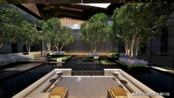 设计师对水景的应用,是生态的,更是融合的,从静心水院漫步到社区景观的重要核心区——200㎡的水榭林间。甄选精致的乌桕木栽植,与水岸汀步相映;滨海蓝的奢华石材铺就花池,辅以下沉式休闲卡座。