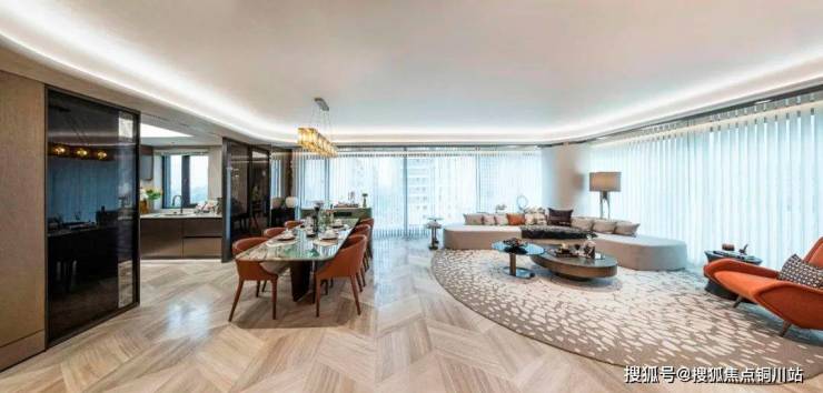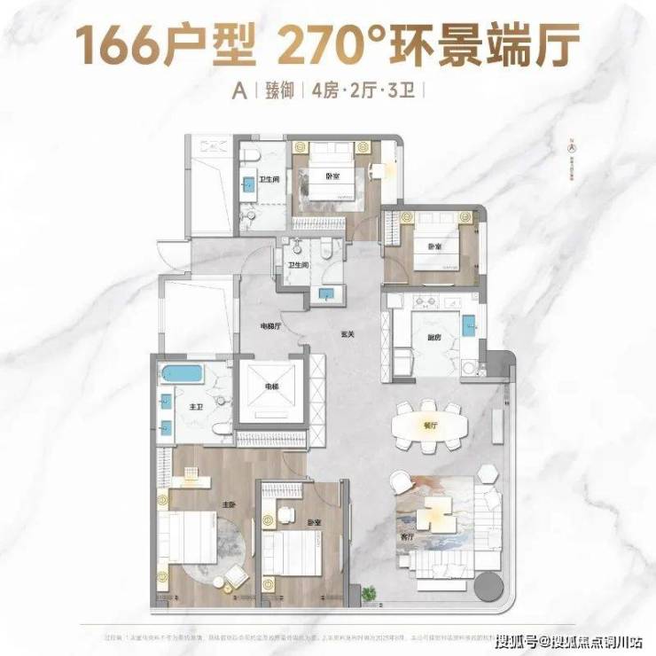 在户型设计上,以166㎡的户型为例,实用面积超200㎡,端厅将近50㎡,配上270°环幕落地窗,极致的视野和采光,既满足了改善阶层对“空间奢侈感”的需求,又提供了丰富的情绪价值。