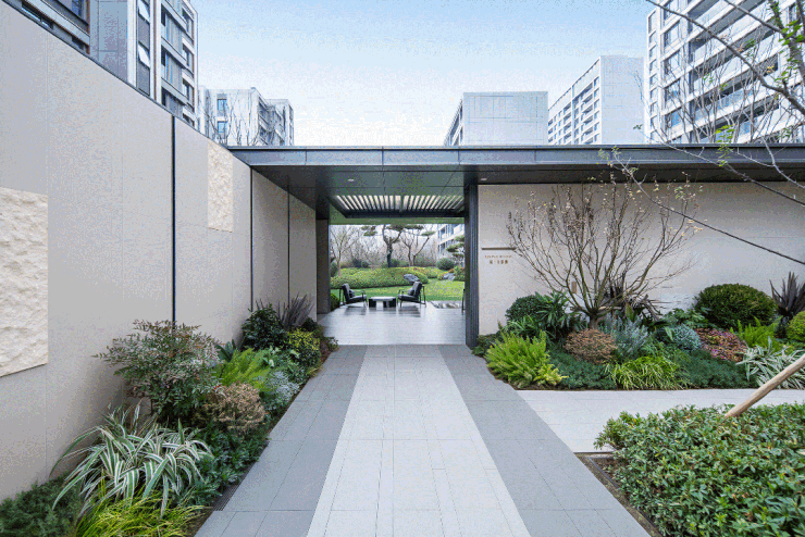 这次项目交付,一脉相承的安缦酒店式东大门,同样让人震撼。两道景墙层层过滤喧嚣,两棵罗汉松分列两侧,搭配丰富花木,构成归家动线的仪式感。