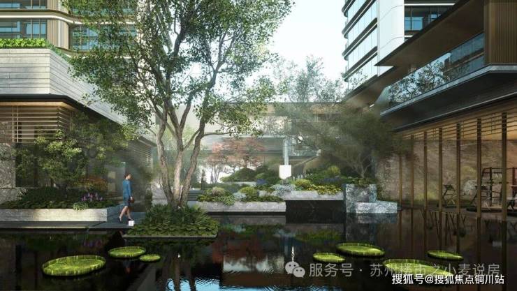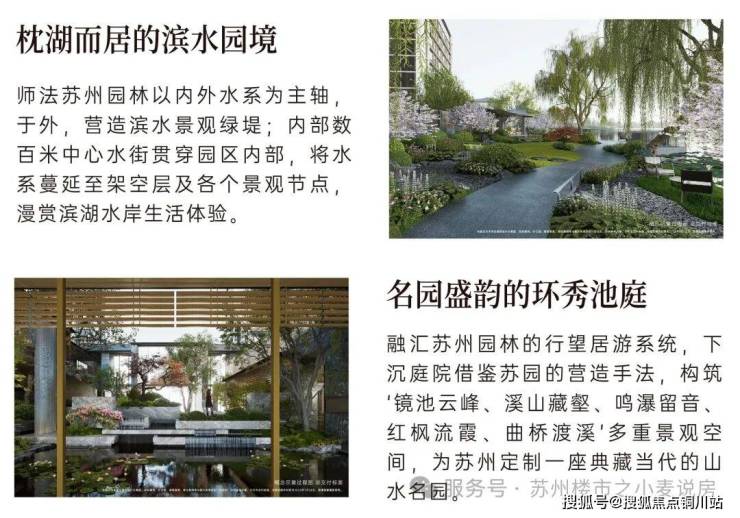 依凭半岛三面水岸的天然资源,以“一堤三面湖”和“水街襟两园”设计笔触,实现滨水互动、开门见水的场景体验;融汇吴门画派、苏州园林造园理念,营造出一座温润如玉的流动庭园。