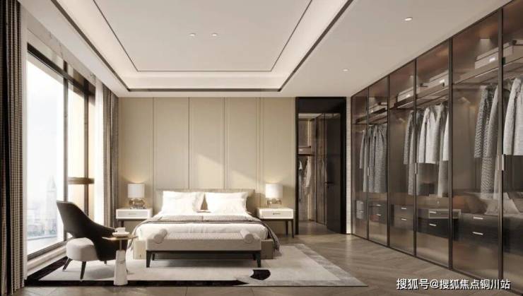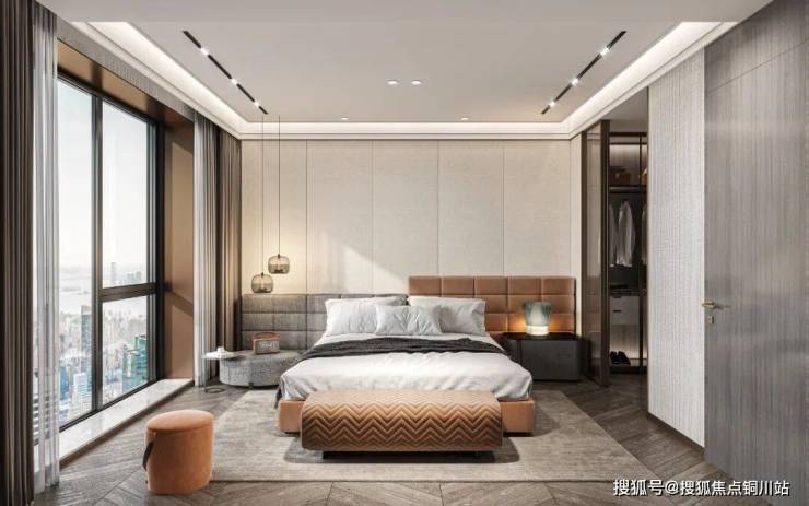 私域主权的终极表达:套房主卧作为专属奢适领地,独立衣帽间与卫浴区从容相连,双台盆、嵌入式浴缸等配置尽显秩序感;部分户型270°观景飘窗,更将曼哈顿One57的云端私密感移植长江之畔。