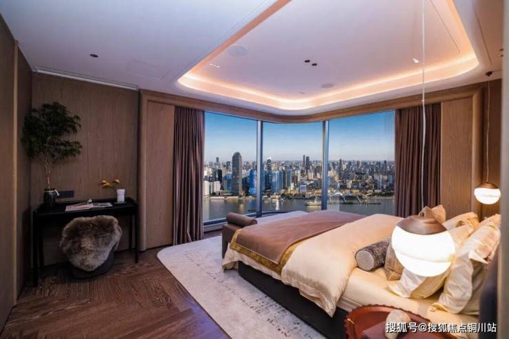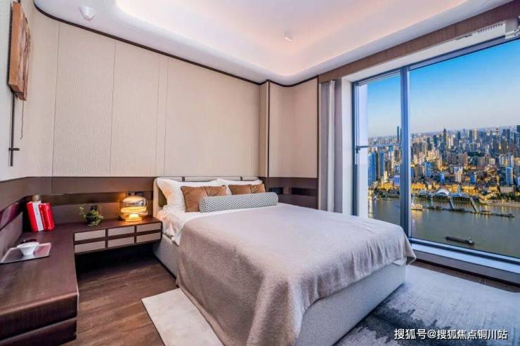 主卧作为家庭的“私属秘境”,近10米的L型观景面同样实现0遮挡,一面瞰江、一面观湖,“一江一湖”双景加持,在区域同面积段主卧中无出其右。除睡眠功能外,设计师预留了5组高阶功能场景:窗边观景睡前半躺区,与爱人并肩静赏江夜渔火,卸下一天疲惫;女主人专属梳妆区紧邻窗边,自然光成为最顶级的补光镜,江景为梳妆增添仪式感;L型步入式衣帽间,家庭中的芭莎秀场,收纳家庭主人的时尚品味;床尾休闲区设置床尾凳,丰富空间层次感;全明主卫嵌入独立观景浴缸,让沐浴时光也能沉浸于江天盛景,奢享感渗透日常。