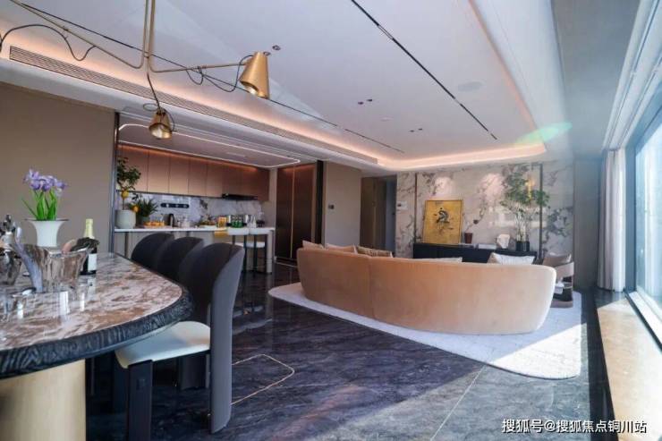 约42㎡的奢阔餐客厅未做固定功能划分,预留了4大场景:江景沙发区可放置超长L型沙发,直面巨幕江景,日常休憩即是沉浸式观景体验;独坐或对坐沙发区开辟静谧角落,晨起咖啡、午后阅读皆有江景相伴;开放式社交岛台连接厨房与餐客厅,形成洄游动线,成为家庭派对的冷餐区与亲友闲谈的社交核心;6-8人家庭餐桌区,让江景成为用餐的天然背景,每一次团圆都更具仪式感。