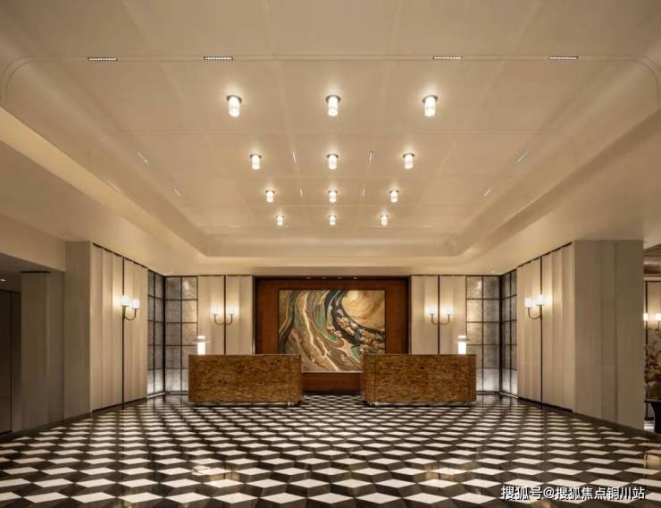 步入门庭,云石吊顶之下,借鉴中国古代建筑中的“藻井”做法,由522片皇家白玉石材拼接而成,凝聚光华,辉映时空。华光之下,中心水池承托起艺术雕塑,莹润皎洁,宛若珍宝。立面则采用铂金钻奢石,搭配墨绿荷塘月色奢石、安哥拉黑奢石花钵、以及手工锻造的巨幅铜门,流淌出一抹温润质感。