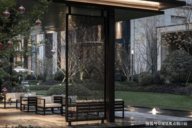 室外会客厅旁,涌泉水景环绕,浪淘沙花岗岩源自稀缺老矿,屏风隔绝出一方共享互动的天地。业主对弈、阅读或聊天,抬头,透过雕花艺术屏风,满目苍翠,美不可言。