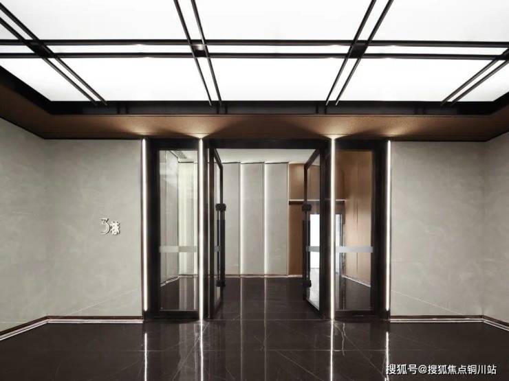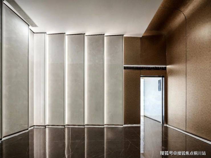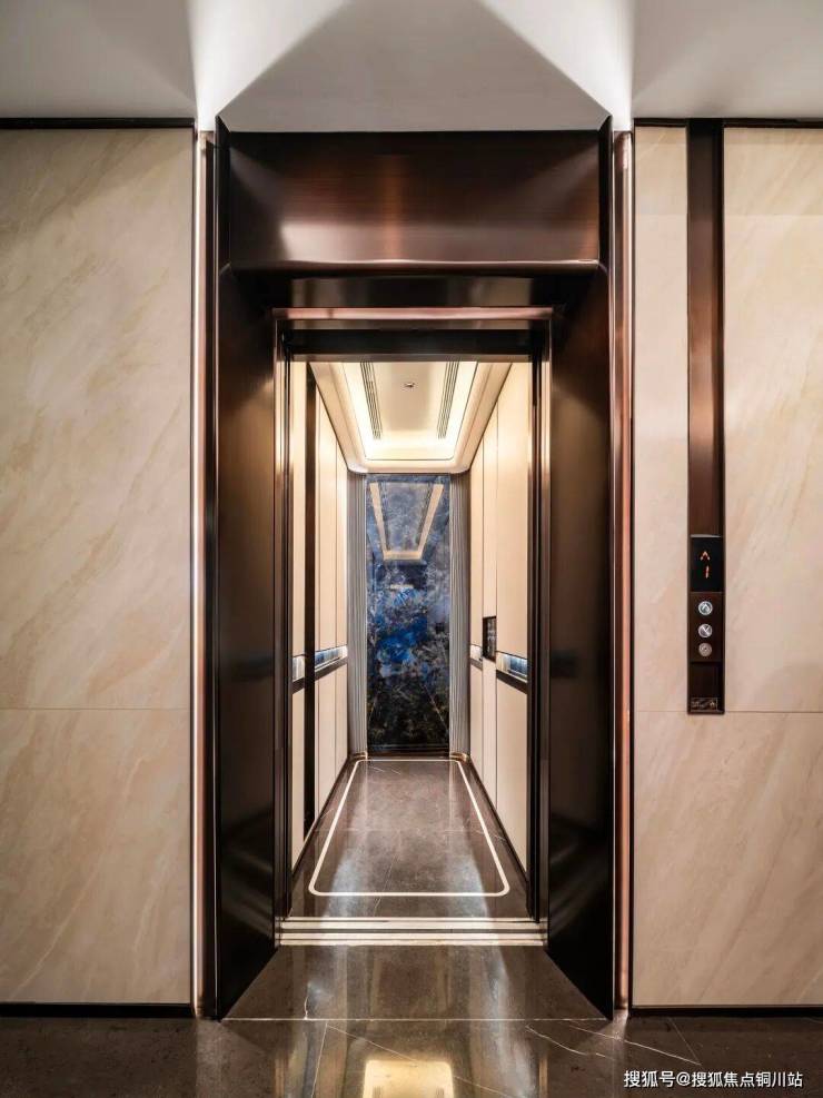 古铜色不锈钢金属电梯门,厅内仿皮革木板铺面,配以蓝翡翠岩板点睛,为空间注入东方瑰丽灵韵。