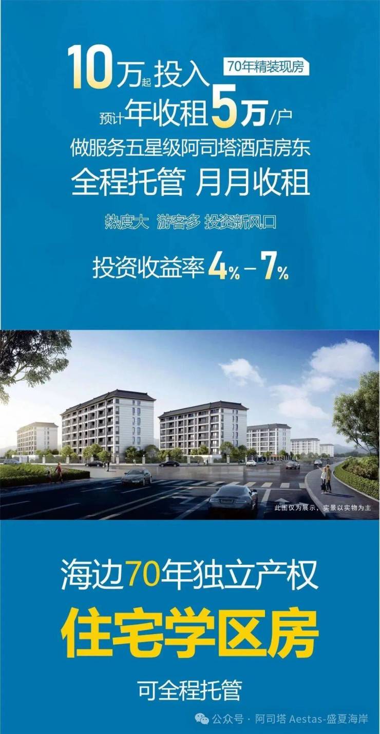 ——不仅如此,石浦的迷人魅力与蓬勃生机,也催生了独特的投资价值。现在,您有机会以10万元起投入,拥有70年精装现房,成为服务五星级阿司塔酒店的房东。项目预计年收租约5万/户,由专业机构全程托管,实现月月收租。凭借石浦日益高涨的旅游热度与持续涌入的游客,这里正成为新的投资风口,预计投资收益率约4%-7%,让您在享受山海之美的同时,轻松坐享资产增值的稳健回报。