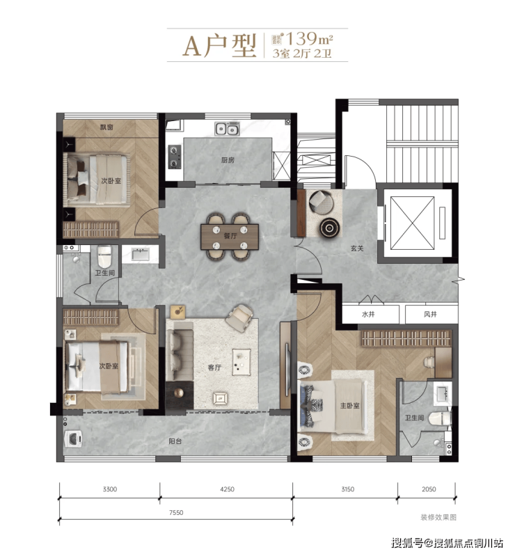 建面约139㎡,三室两厅两卫。
