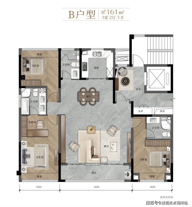 建面约161㎡,三房两厅两卫。