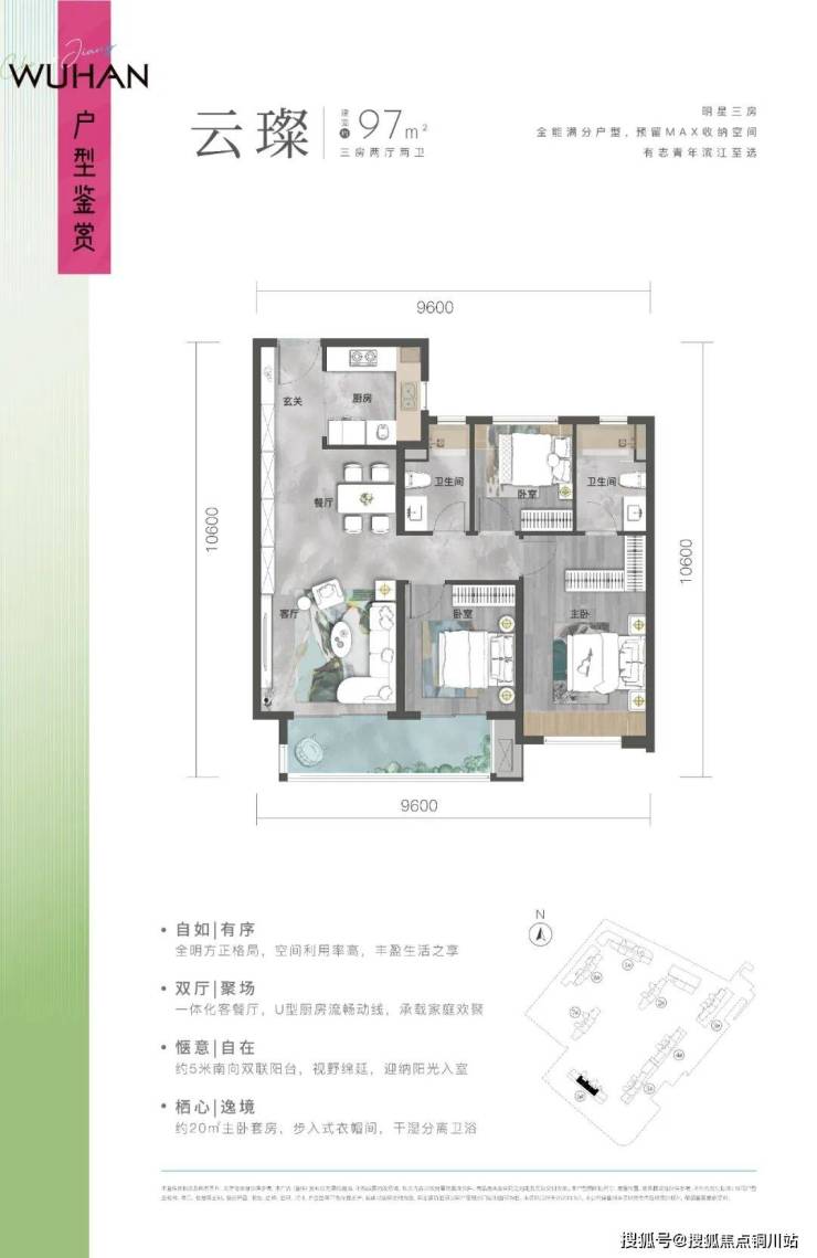约97㎡,同样做到三面宽朝南,主卧做到步入式衣帽间+南北通透。并且还出了2卫,在功能性上做到了最大化。