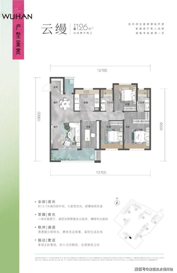 而126平的四房,做到四开间朝南+双阳台。