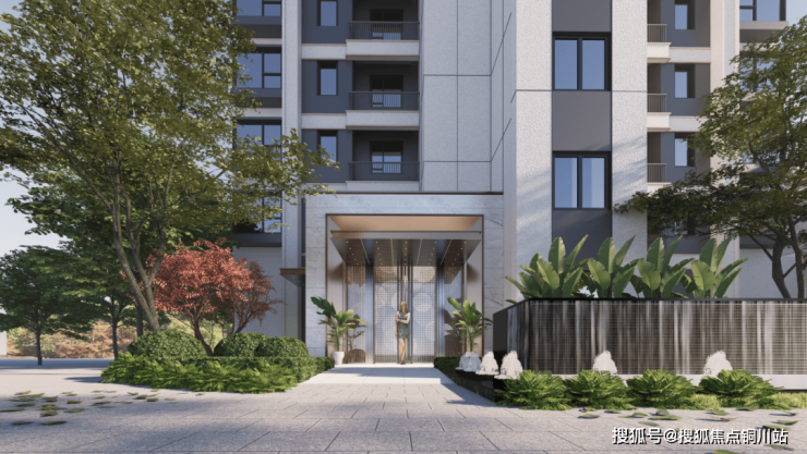 小区商业配套及入口大堂采用铝板和干挂石材设计,住宅单元入口也采用铝板及石材。住宅主体采用仿石涂料一体板,整个立面简洁现代,色彩温暖,时尚典雅。