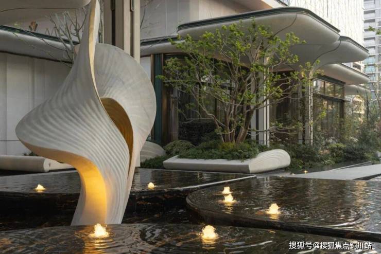 水景饰面选用蓝钻花岗岩,其曲面池壁以精工压顶收口。铺装、水景与花池之间的所有交界处,均施以细腻的倒圆角工艺,使硬质界面间的过渡浑然一体。精细调校水面高度,使其在铺装交界处略低于完成面,达成水陆无界的消隐效果。在异形树池区域。水面则精密控制在结构托层之下,成功塑造出水体悬浮的视觉意象,同时有效规避了浅色石材因长期浸水而可能产生的泛碱现象。排水篦子巧妙嵌入了定制品牌标识,于功能细节中暗合设计主题。