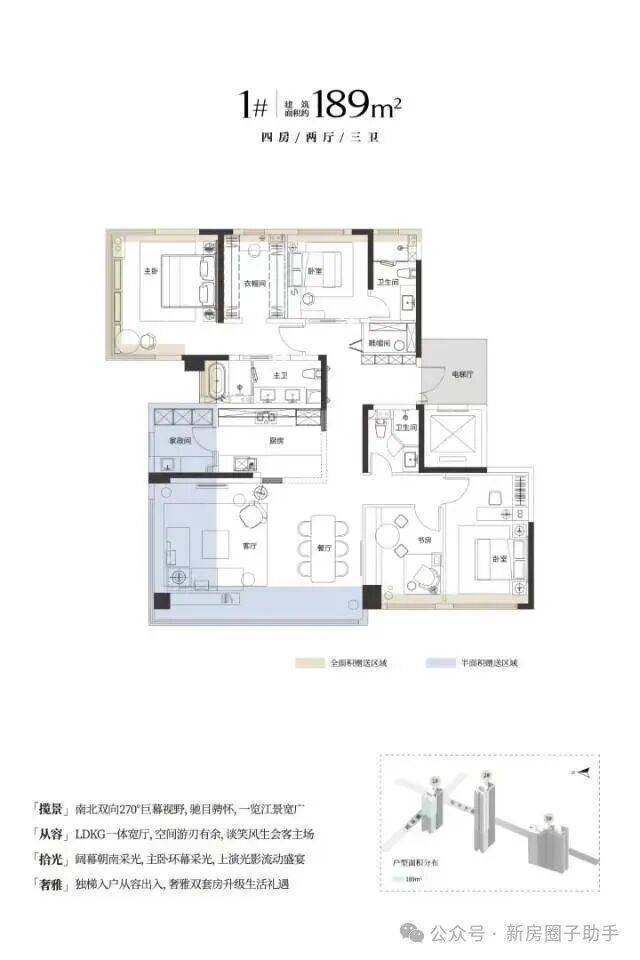 该户型为1号楼16-28层西边户,在153户型基础上增加了西侧家政间和北侧卫生间等面积,高区和低区做成了不一样户型。主卧做到了三面全景落地窗,客厅也有西南向270度的景观视野。该户型是本项目的王炸户型,即可以保证采光,也有不错的江景。