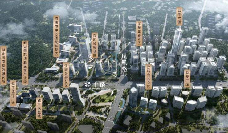 约2000亿元产值金融城,将引进50+金融机构省级总部,汉峪金谷已聚集40+总部企业,长岭高科片区华为山东区域总部、百度山东总部等5大科创龙头聚首,融汇2300+科创金融企业。