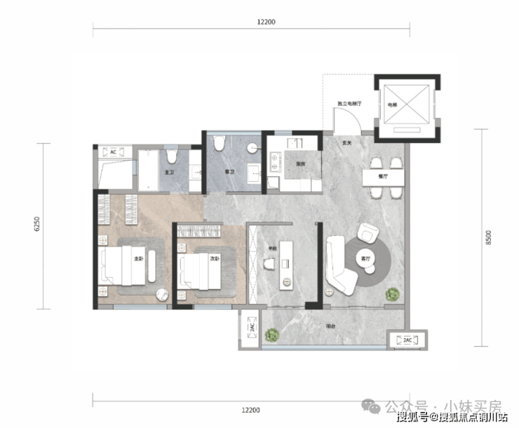 约12.2米大面宽设计,以往只常见于建面约160平户型。这样做不仅放大了采光面,还升级了生活功能性,又给生活增加了一份松弛感。