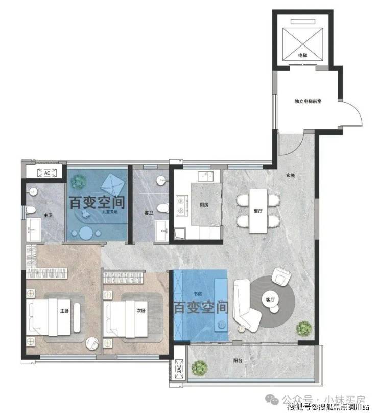 主卧对侧的百变空间,既可以做独立空间使用,也可并入到主卧,改造成主卧的小客厅或书房。