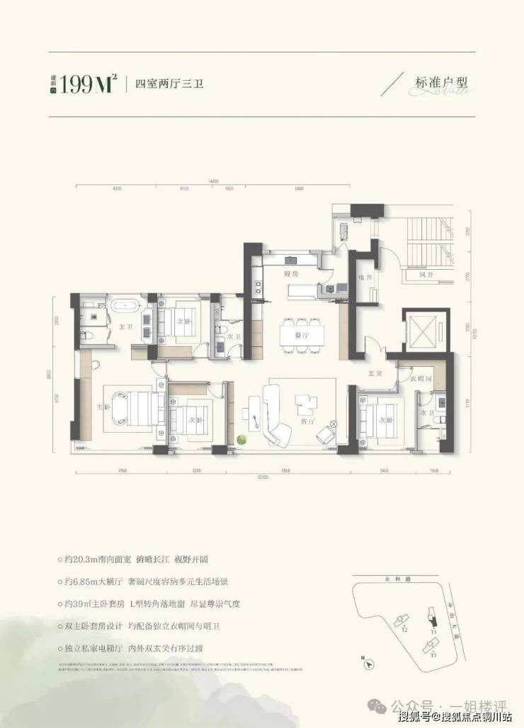 以建面约199平新品户型为例,在此前四房两卫的基础上,升级为四房三卫,以奢阔双主卧套房重构空间哲学。