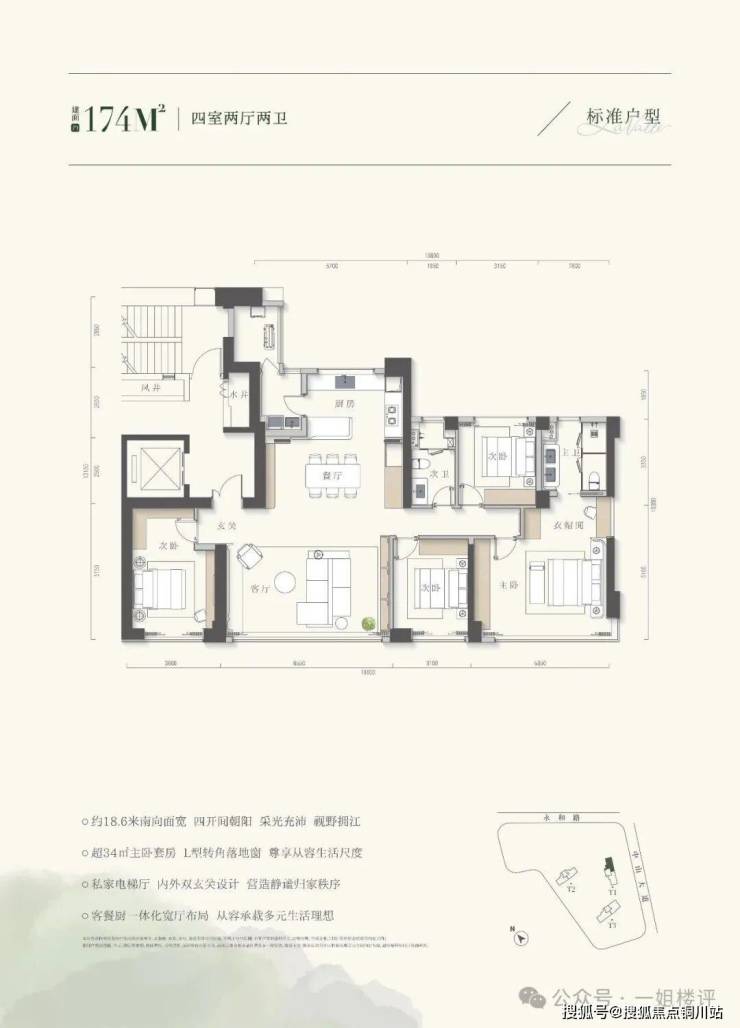 这个户型在T1号楼的东头,四开间朝阳,可以迎接早上的第一缕阳光;约18.6米南向面宽,则尽可能的引江景与阳光入室。