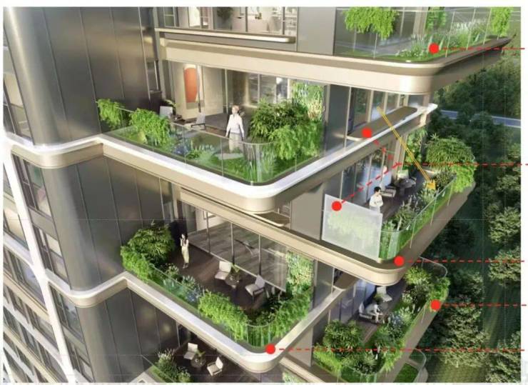 在错层的基础上,上下层的空中花园,使用绿化和半透栏板遮挡视线,避免对视的尴尬,并且,在上层住户的窗户前增加飘板,避免室内一眼看透,保证私密性。