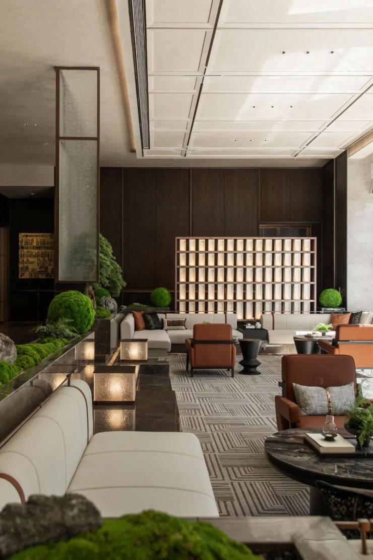 中轴对称布局凝练着传统文化中对平衡、对称、秩序的追求,彰显了古人的宇宙观、哲学观与审美情趣。沙盘区与水吧区均布局于空间中心,并延续中轴对称的设计理念,连接两侧的洽谈区,寓意空间、人、自然的和谐统一。