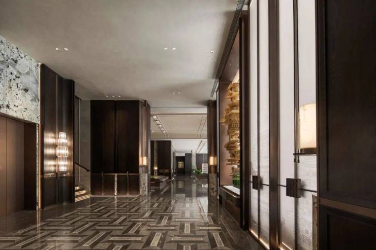 外部廊桥到内部空间的转换,以极具端庄奢华的前厅设计景象作为开场白,中轴对称的空间布局带来视效的震撼,仿若即将进入一片颇为迷离幽深的秘境。