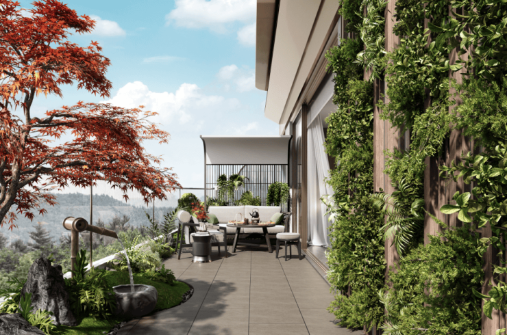 区别于传统阳台进深约1.5m,项目露台进深最大约3.2m,尺度升级的同时形成约270°观景视野,营造出庭院深深的空中花园体验。
