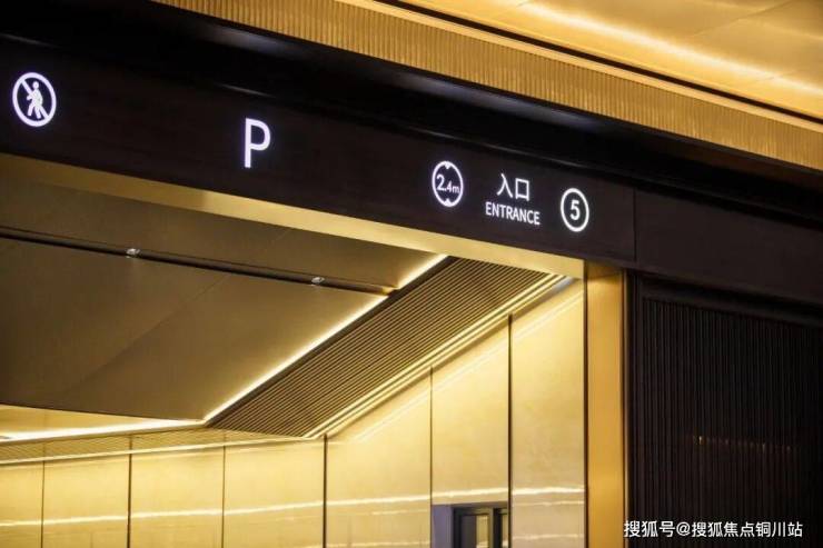 古铜色铝板吊顶,内嵌线型灯带,形成一条璀璨的归家“鎏金廊道”,一直延伸到地下。