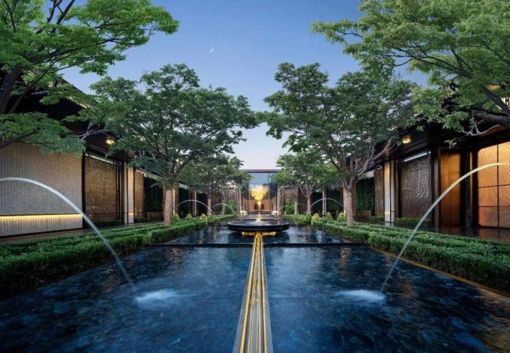 窗外又是高度对称的长廊水院。喷泉与长廊,给你对称仪式感;水光树影,给你静谧;玉石柱式与金属格栅,给你典雅。他们把准宝石级别的「蓝翡翠」奢石,铺装在水底,它有一个很美的名字,叫做「银河的眼泪」;阳光会把池底的那抹蓝色,反射到你的眼底。