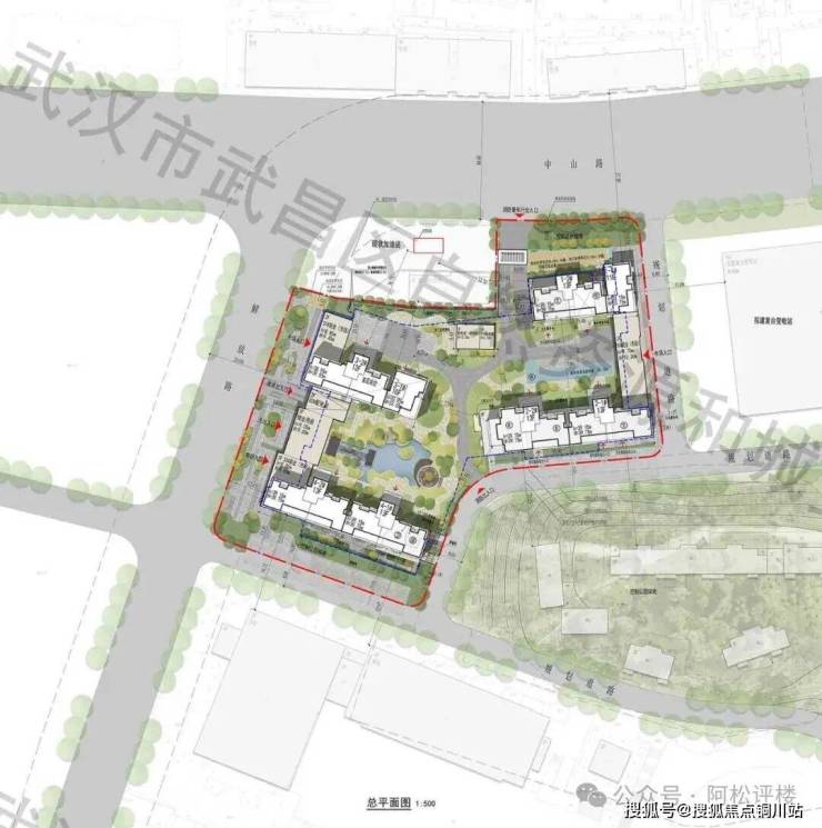项目体量比较小,从平面图来看,1号楼1单元、3号楼1单元可能为非常罕见的1梯1户结构,其他单元可能均为1梯2户或2梯2户纯板楼结构。3、4号楼之间规划有水景,3号楼2单元首层架空。临中山路一侧为防护绿地。