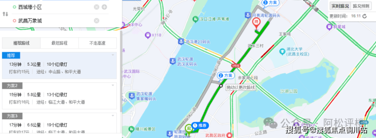 西侧解放路是南向北方向单行线,和平大道红绿灯非常多,中山路-友谊大道段快速化改造未建,车流量一向很大。附近的和平大道南延线已经通车,可以向南连通二环线(汉阳方向)与白沙洲片区,不过隧道口位于尚隆路附近,从项目进出隧道都需要掉头绕行。