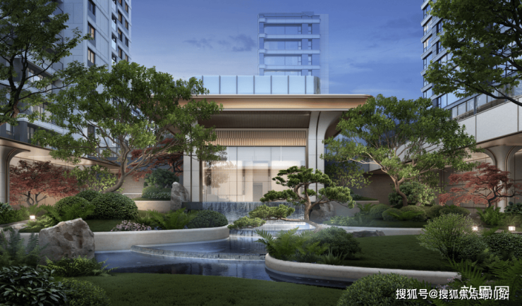 若说园林是日常的温柔,那社区里的两处下沉庭院,便是藏在细节里的惊喜。一方是归家仪式庭,层叠景致与立体山水相映,呈归家礼序之美;另一方中庭鎏光水院,借光影流水与四时之景,柔和了建筑与自然的边际,静谧之中生长无限诗意。