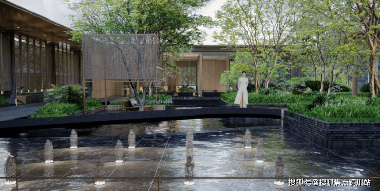 一条为踏溪步道,业主可沿林荫小径拾阶而上、踏溪而行,穿过水院感受流水潺潺与花香阵阵;另一条为无障碍风雨连廊,漫步在浓荫与流水围绕的连廊,即便是雨天时归家,也能步履轻盈,静听雨落。