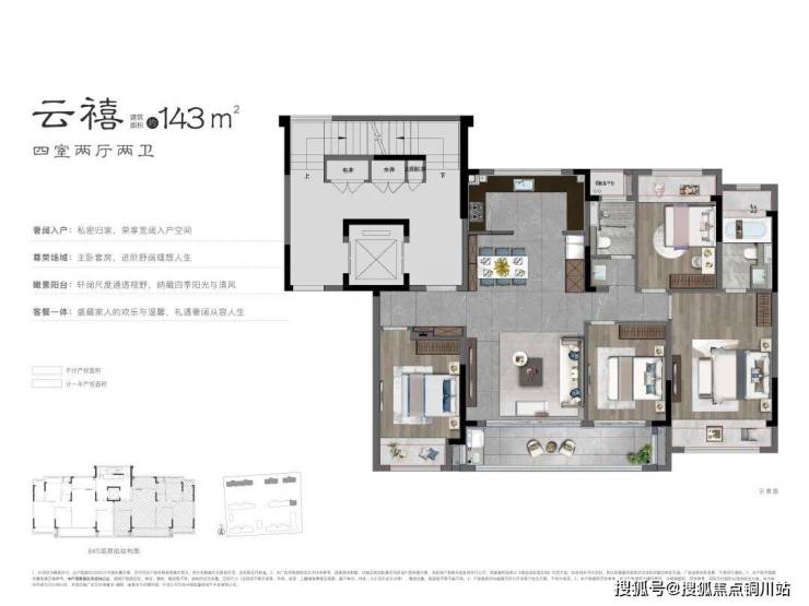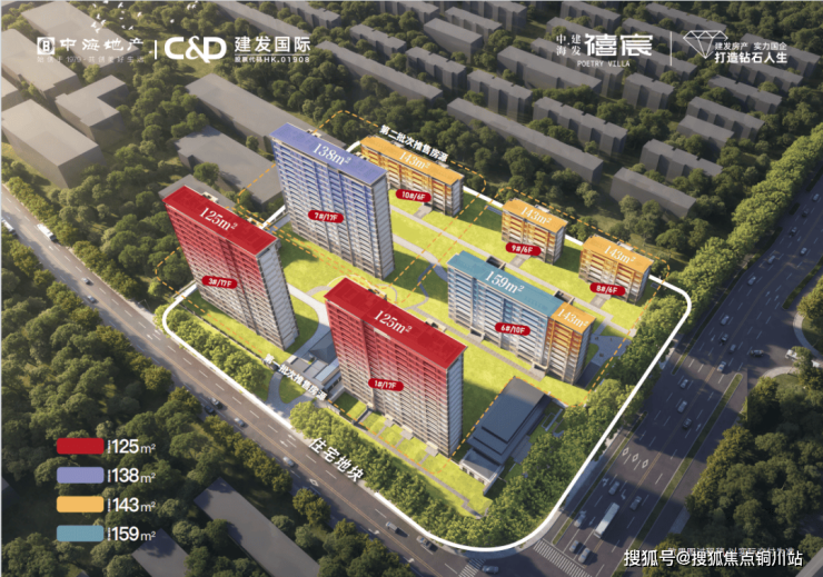 从鸟瞰可以看到,6F-10F洋房有两个户型,3幢约143㎡四房和1幢约159㎡四房;17F小高层也是两个户型,2幢约125㎡“3+1”房和1幢138㎡四房两卫。