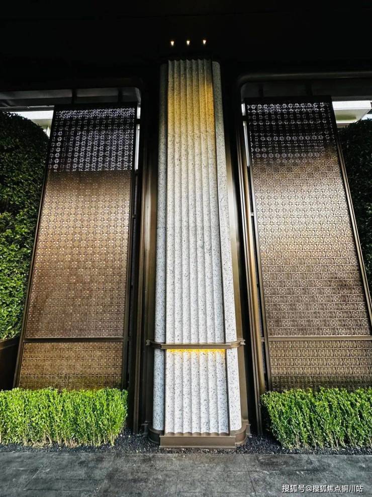对称式造景,中部柱形圆弧立柱,两侧铝板雕花屏风,屏风上的纹样是紫金翡丽甲第的专属符号,两侧辅以树木阵列,经典气派。