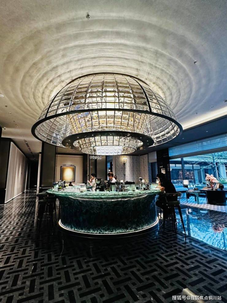 逐光星庭水吧台同频海鸥丽晶的艺术审美,整体水吧台造型以及艺术灯具的设计灵感来源于精致的水晶首饰盒,绿水晶奢石吧台,流光溢彩。