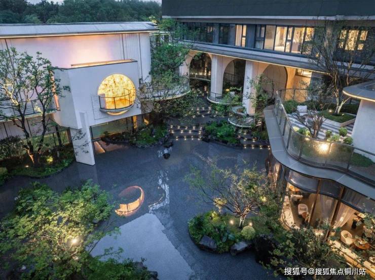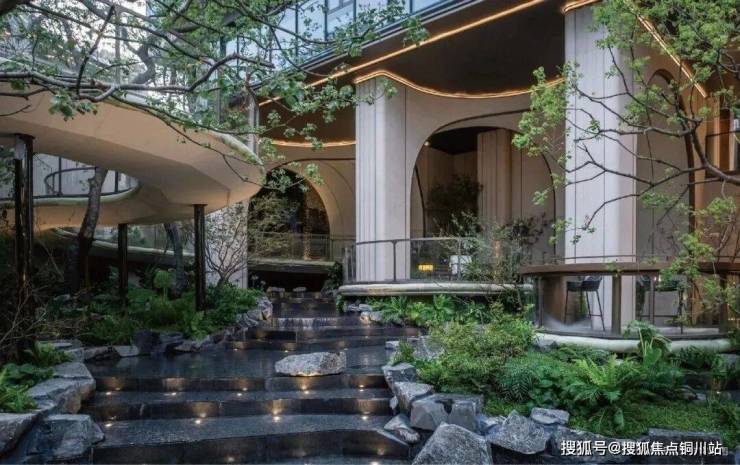 以九曲玉带桥、风雨连廊串联园林,植被搭配了珍贵全冠移植元宝枫、红果冬青、文冠果等,打造姑苏山水意境与现代功能的共生空间,细节处融入山石、飞瀑、湿地、草甸、穹顶等东方韵味元素;