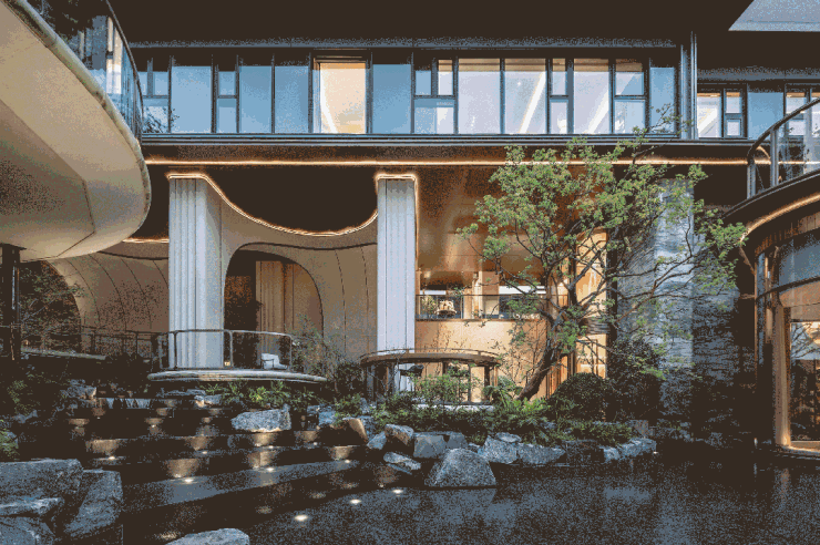设置专属环岛落客区,以水面星光与潺潺流水声缓解归家疲惫;门楣处采用潘多拉透光云石,打造温柔指引效果;接待厅内铜制雨链垂落,水滴沿阿富汗青玉流至玄石端砚,与室外树影、风声呼应,还原东方雅致意境。材质上,用到了进口维纳多石材、潘多拉透光云石、阿富汗青玉、玄石等。