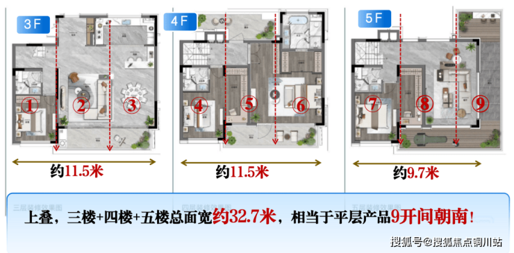 而樾府全新升级版每层3个面宽 ,每户实际得到的是6面宽(下叠)甚至9面宽(上叠),IMAX巨幕采光面,堪比大平层一整个单元的采光尺度!
