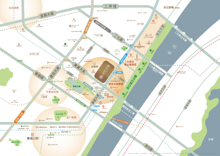 生态环境优美:距离汉口江滩约 1 公里,距离解放公园约 1.3 公里,附近还有二七公园等,为居民提供了休闲散步、亲近自然的好去处。