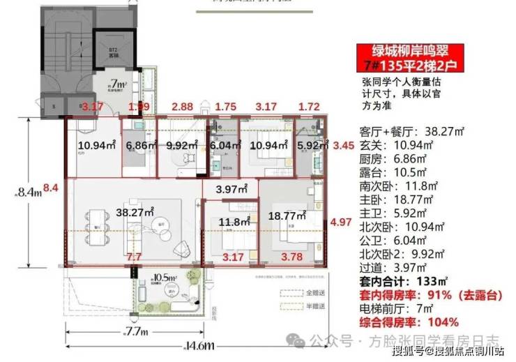 【135平标准4房】7号楼边户,还剩5套4楼以下楼层,南面是3层的停车楼,采光问题不大、视野有些影响,单价1万1左右。