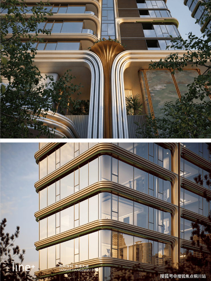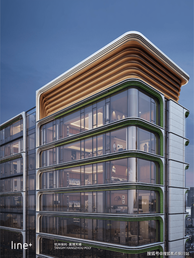 建筑设计由line+朱培栋操刀,从杭州本土文化中汲取灵感。设计摒弃了早期对海外风格的简单复制,将龙井春芽、钱塘潮水、南宋官窑等元素融入建筑,最终塑造出独特的“钱塘春芽”立面—— 青绿色彩釉陶板如嫩芽般包裹建筑,细节处的冰裂纹理暗藏宋瓷韵味,为奥体打造了真正具有杭州辨识度的建筑符号。
