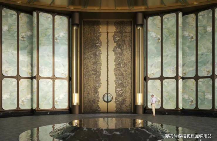 大门是出自著名铜雕大师朱炳仁先生团队之手。高大巍峨的铜门,合拢起来,便是非凡威仪;打开状态,又是一件可触摸的艺术品。