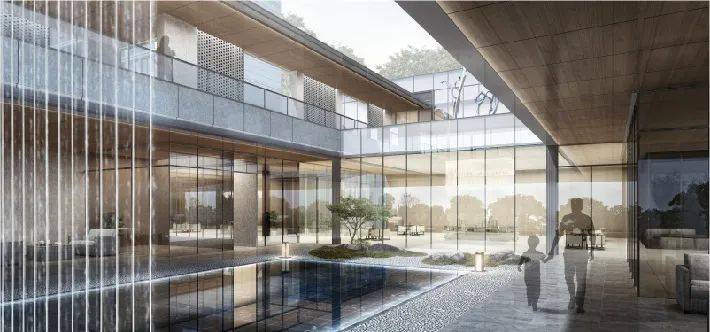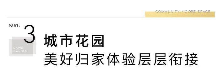 “城市花园”就镶嵌在入口与园林之间,在城市喧嚣与园区宁静间,配以多层次景观点缀,包裹从城市切换到生活的过渡氛围,形成一处转换心情的场域。业主归家穿越其中,仿佛置身陶渊明笔下“见闻水声潺潺,仿佛若有光,复前行,豁然开朗,别有洞天”的诗意画境之中。