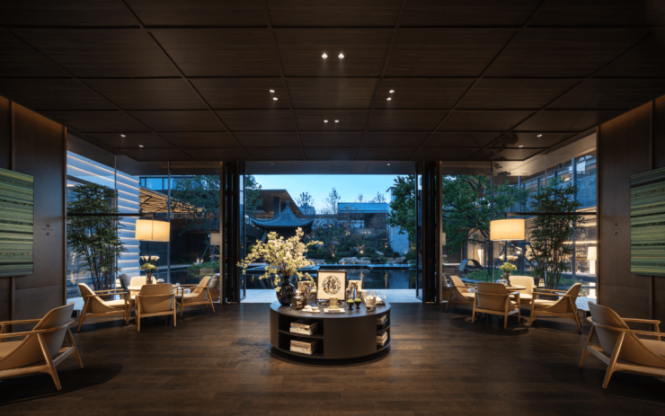 地上归家动线作为社区的主动线,将小区的主入口巧妙地设计在了公园的内部,使得归家即入园。从公园主路引向恢弘门厅,穿越镜面水院和“小梅岭”的梅香径,最终抵达精装大堂的私属归门。